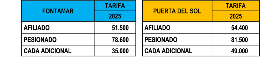 - Para este 2025, nos complace anunciar que el afiliado solo deberá cubrir el 49,95% en el Hotel Puerta del Sol y el 48,58% en el Hotel Fontamar.
