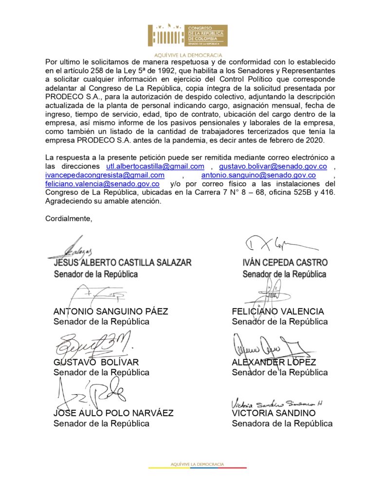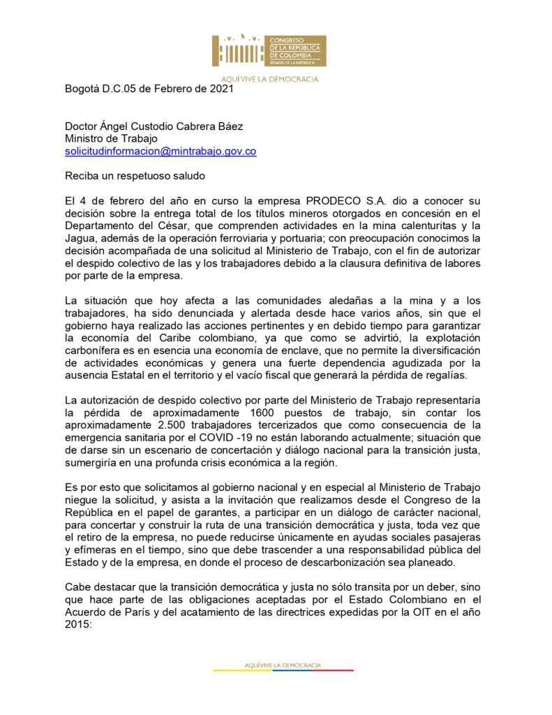 Mediante carta fechada el pasado 5 de febrero y radicada hoy, lunes 8, las y los senadores de oposición Victoria Sandino, Jesún Alberto Castilla Salazar, Iván Cepeda Castro, Antonio Sanguino Páez, Feliciano Valencia, Gustavo Bolívar, Alexánder López y Jose Aulo Polo Narváez; solicitaron urgente atención al Gobierno Nacional y al Ministerio del Trabajo en Particular, denegar la solicitud de despido colectivo radicada por la multinacional Prodeco, tras su anuncio de renunciar al título minero que compromete la operación de las minas La Jagua y Calenturitas en el Cesar, la Sociedad Portuaria de Puerto Nuevo en Santa Marta y la sociedad de Ferrocarriles del Norte de Colombia, Fenoco; solicitud que dejaría sin ingresos a más de 4.000 familias de la región caribe colombiana.