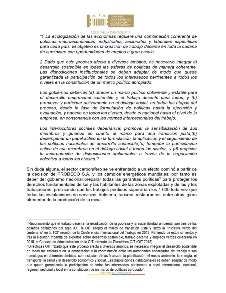 Es por esto que solicitamos al gobierno nacional y en especial al Ministerio de Trabajo niegue la solicitud, y asista a la invitación que realizamos desde el Congreso de la República en el papel de garantes, a participar en un diálogo de carácter nacional, para concertar y construir la ruta de una transición democrática y justa, toda vez que el retiro de la empresa, no puede reducirse únicamente en ayudas sociales pasajeras y efímeras en el tiempo, sino que debe trascender a una responsabilidad pública del Estado y de la empresa, en donde el proceso de descarbonización sea planeado.