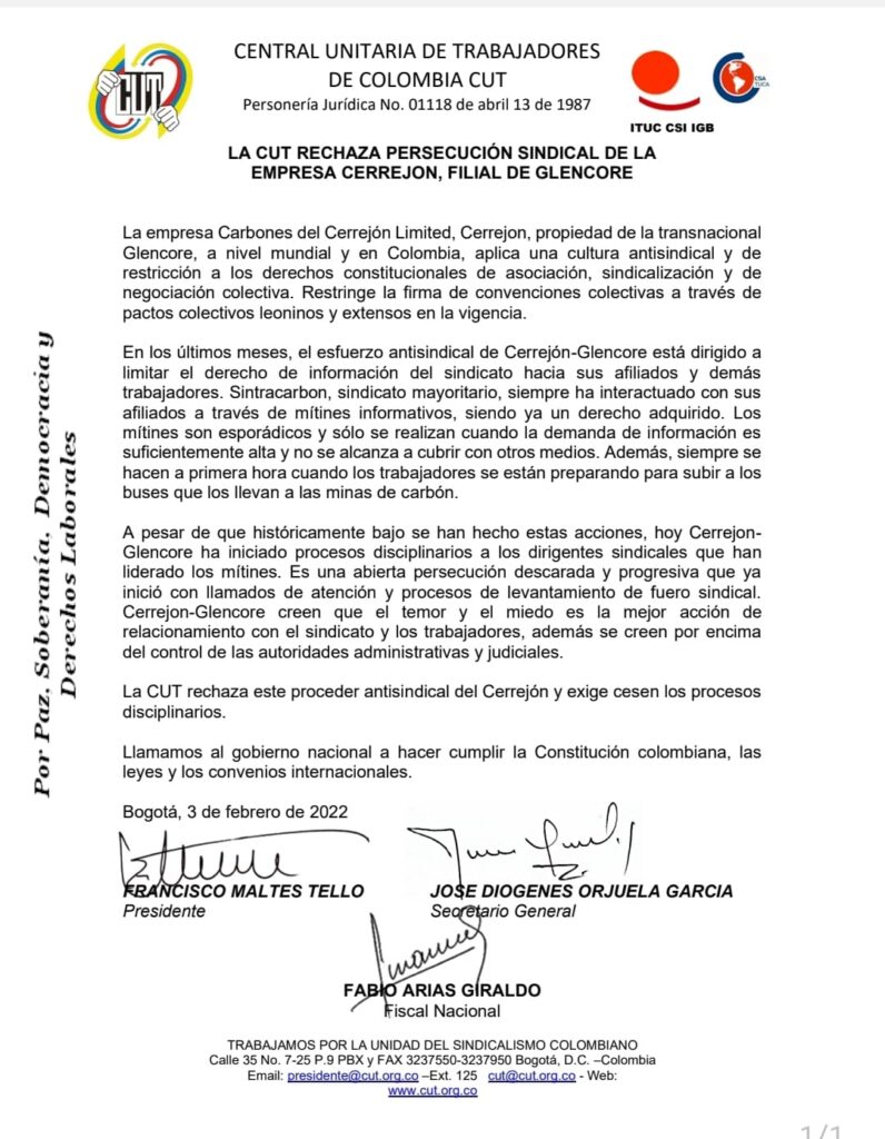 Nuestra central denuncia y rechaza la persecución antisindical que está ejerciendo Cerrejón a nuestra organización. Agradecemos a la Central Unitaria de Trabajadores este pronunciamiento y exigimos a Cerrejón, propiedad de la multinacional suiza Glencore, que cumpla las leyes colombianas y los artículos de la Constitución Política de Colombia que protegen el libre desarrollo de la libertad sindical.