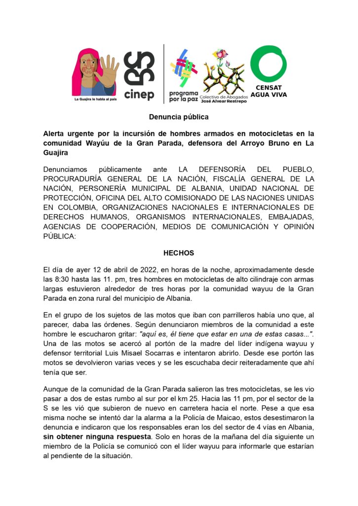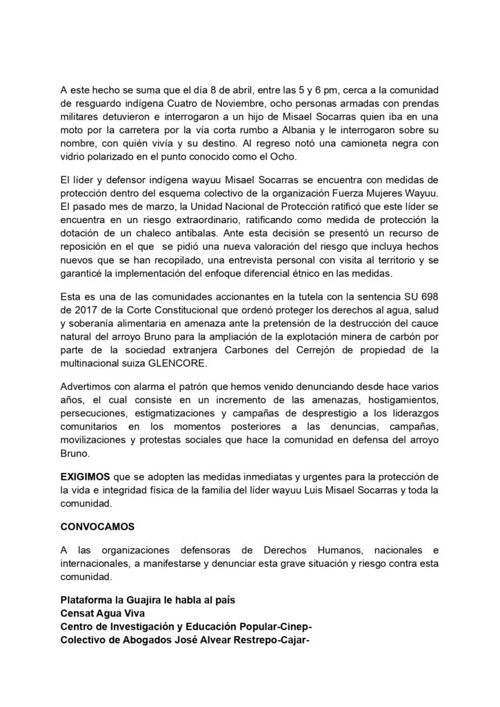 Según la denuncia, los hombres motorizados, quienes portaban armas largas, intentaron entrar por el portón de la casa de la madre del líder wayúu y defensor del territorio Luis Misael Socarrás, mientras se les oía gritar: “aquí es, él tiene que estar en una de estas casas…” y siguieron rondando la zona por casi tres horas. Este hecho se une al ocurrido el pasado 8 de abril, cuando 8 personas armadas y con prendas militares detuvieron e interrogaron a un hijo de Luis Misael mientras se desplazaba por la vía que conduce al municipio de Albania, en cercanías del resguardo Cuatro de Noviembre.