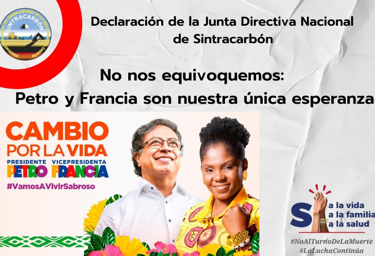 Declaración de la Junta Directiva Nacional de Sintracarbón – No nos equivoquemos: Petro y Francia son nuestra única esperanza
